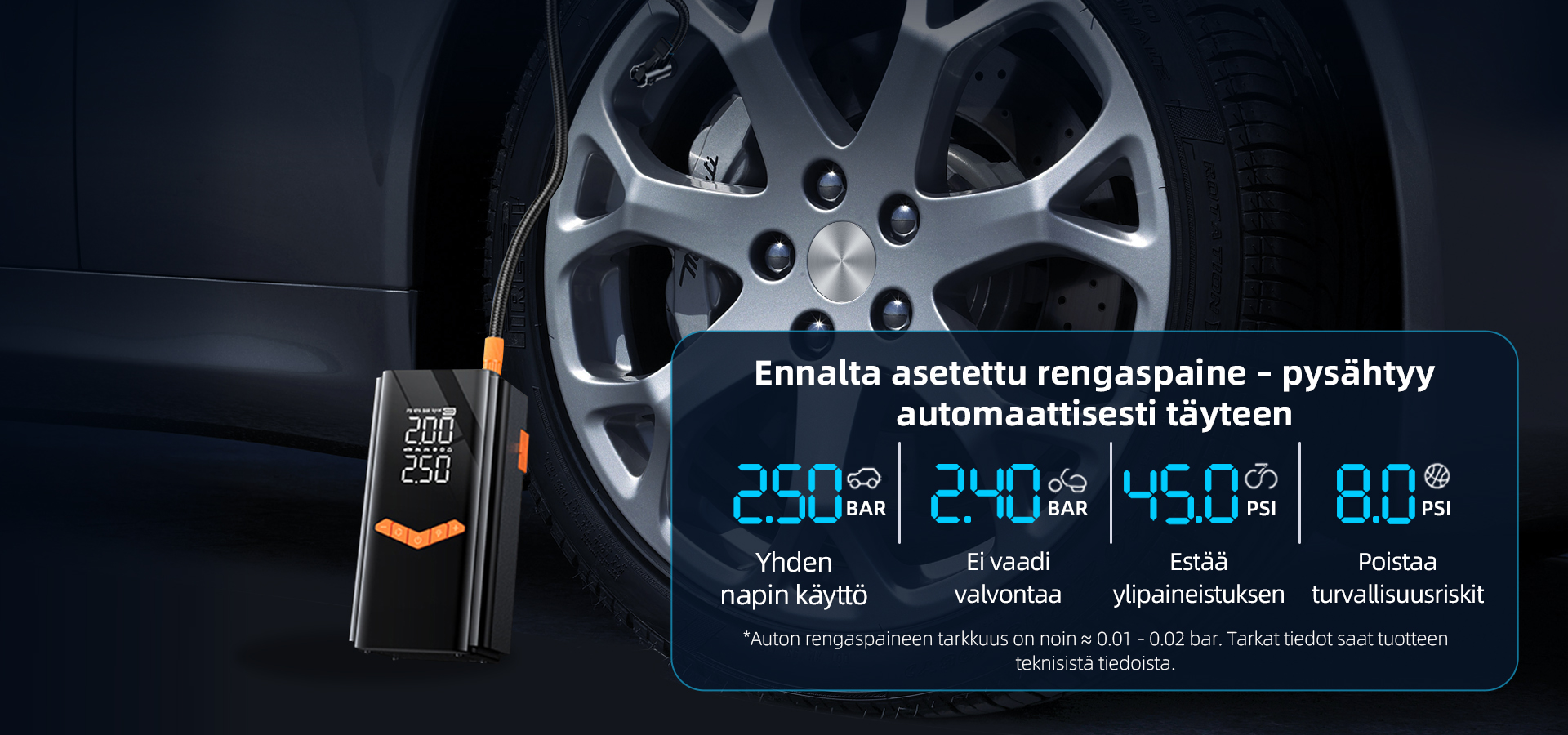 ·Säädä tavoitepainetta "+"/"-" -painikkeilla (pysähtyy automaattisesti saavuttaessa)