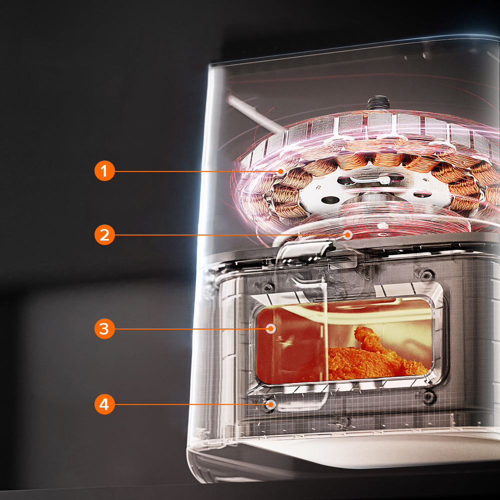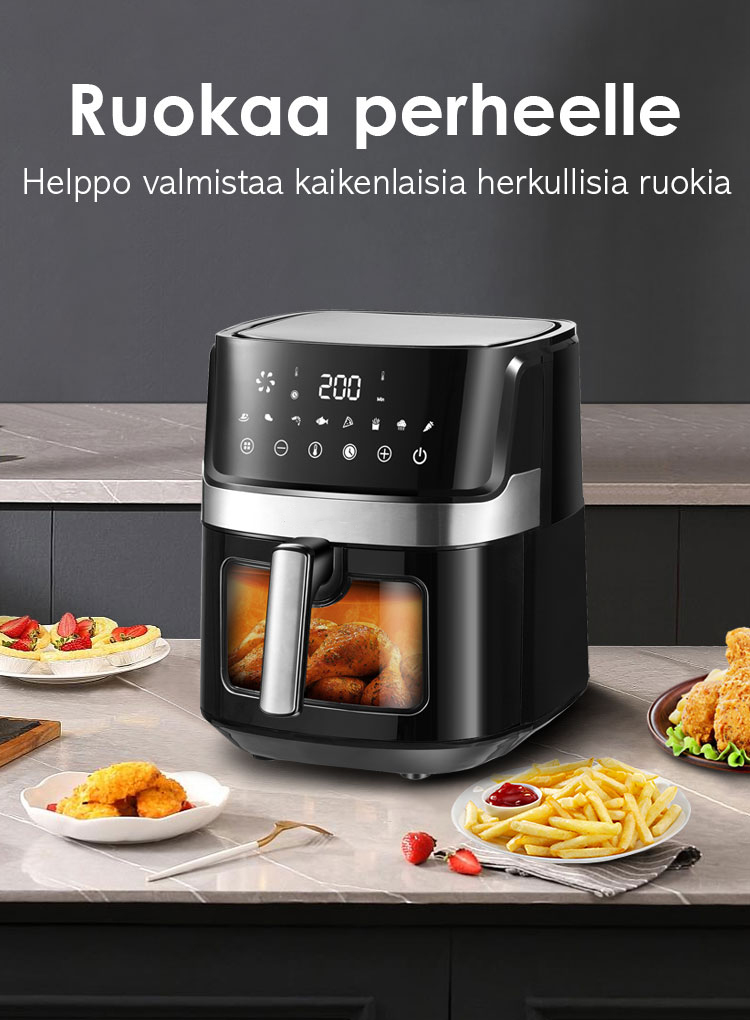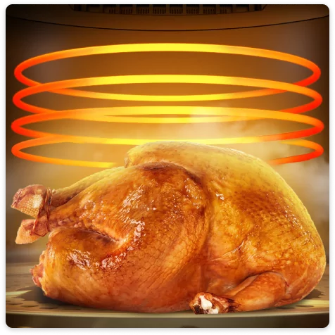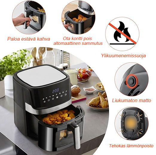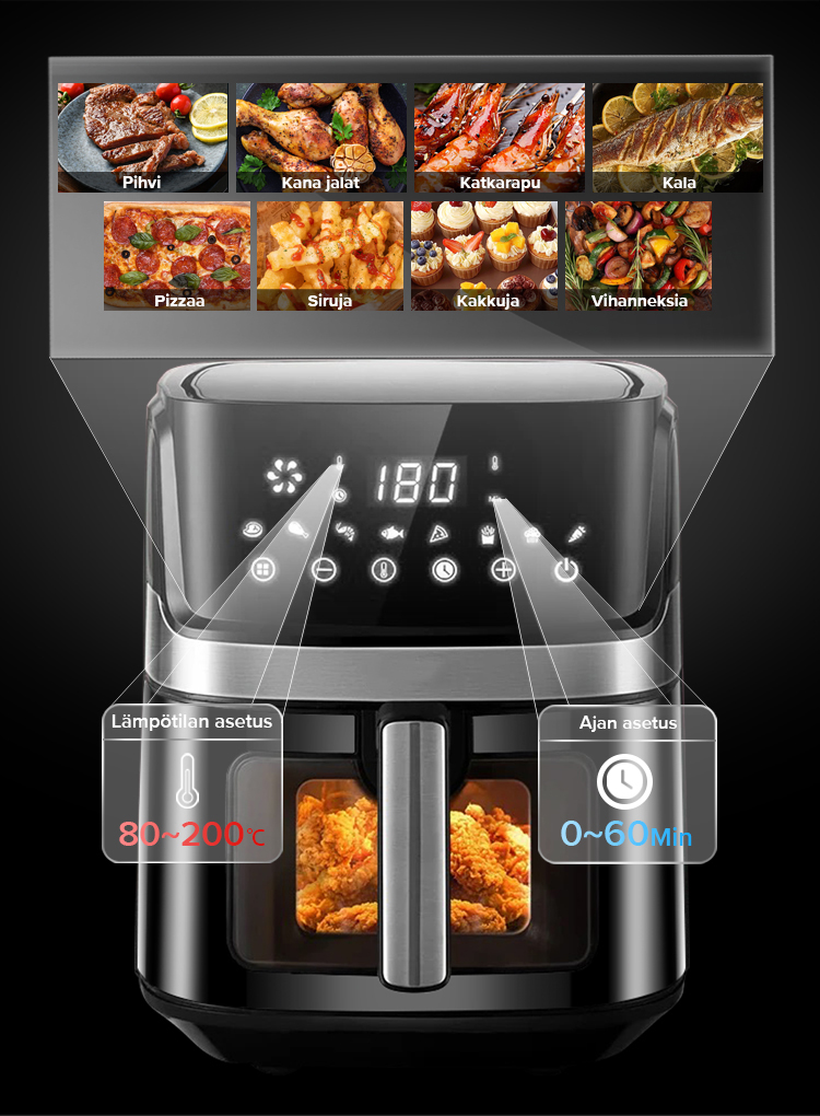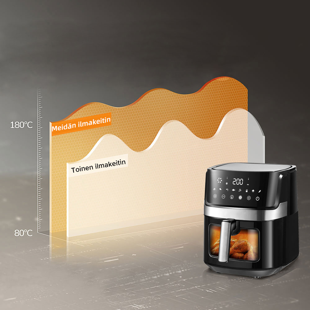 Ilmakeittimessä käytetään 360° nopeaa kuumailmakiertoa varmistaakseen, että ainekset kuumenevat nopeasti kaikista suunnista, upea friteerausmaku ja rapea rakenne saadaan ilman rasvaa ja kaloreita.