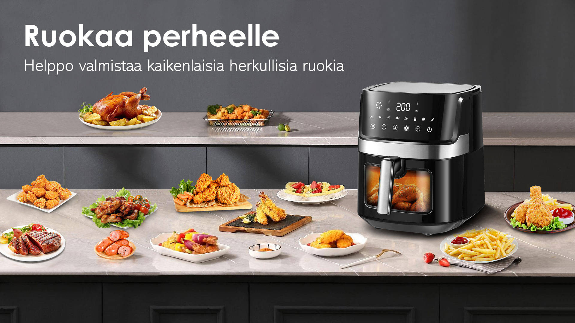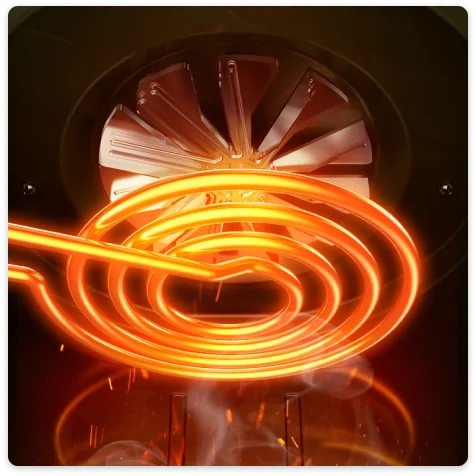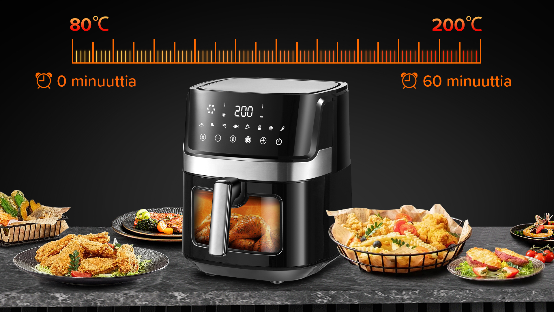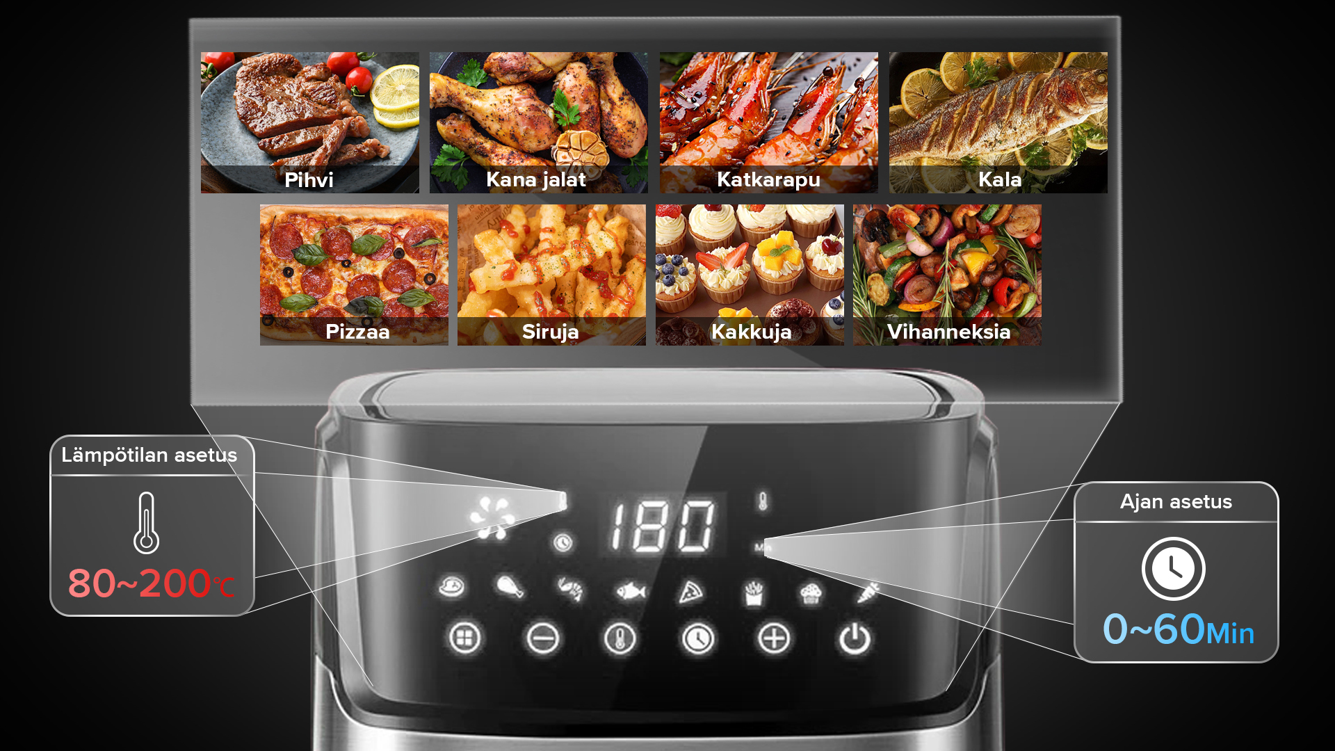 Ilmakeittimessä käytetään 360° nopeaa kuumailmakiertoa varmistaakseen, että ainekset kuumenevat nopeasti kaikista suunnista, upea friteerausmaku ja rapea rakenne saadaan ilman rasvaa ja kaloreita.
