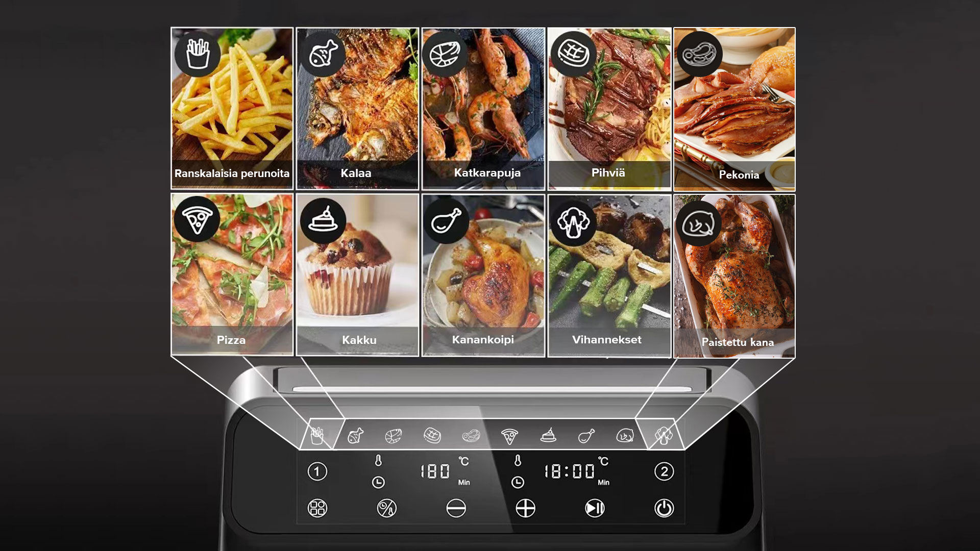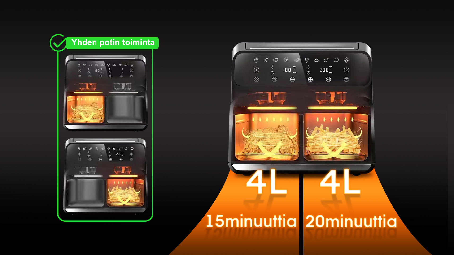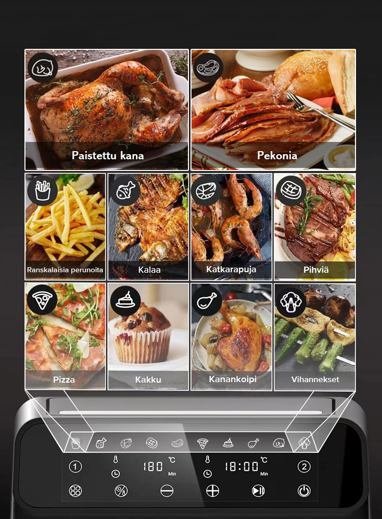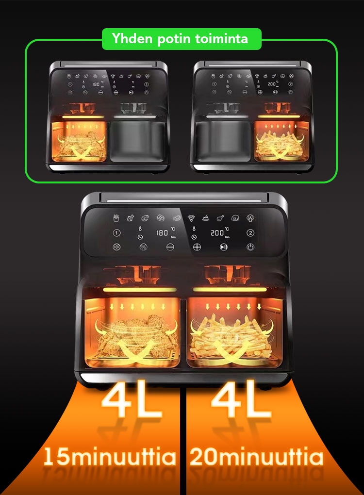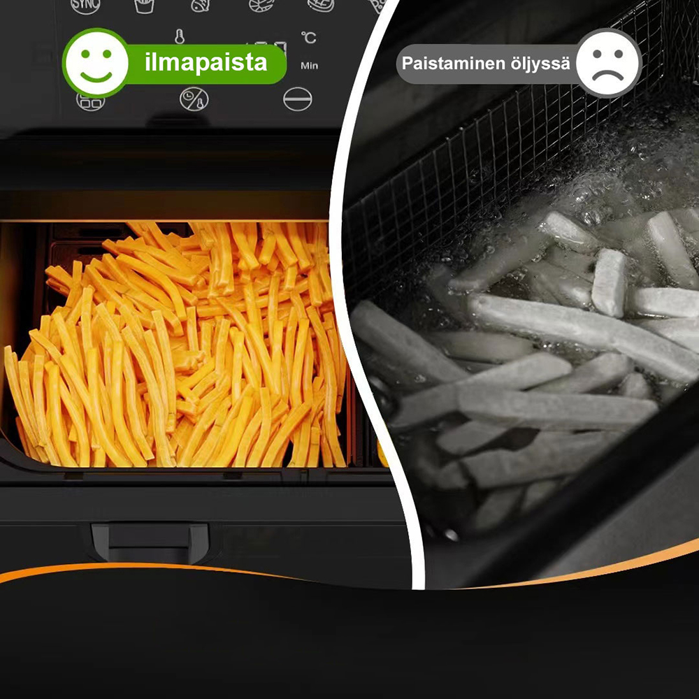 Se käyttää tulistettua ilmaa ja tehokasta ilmavirtausrakennetta rapean, herkullisen paistetun ruoan valmistukseen ilman syyllisyyttä.