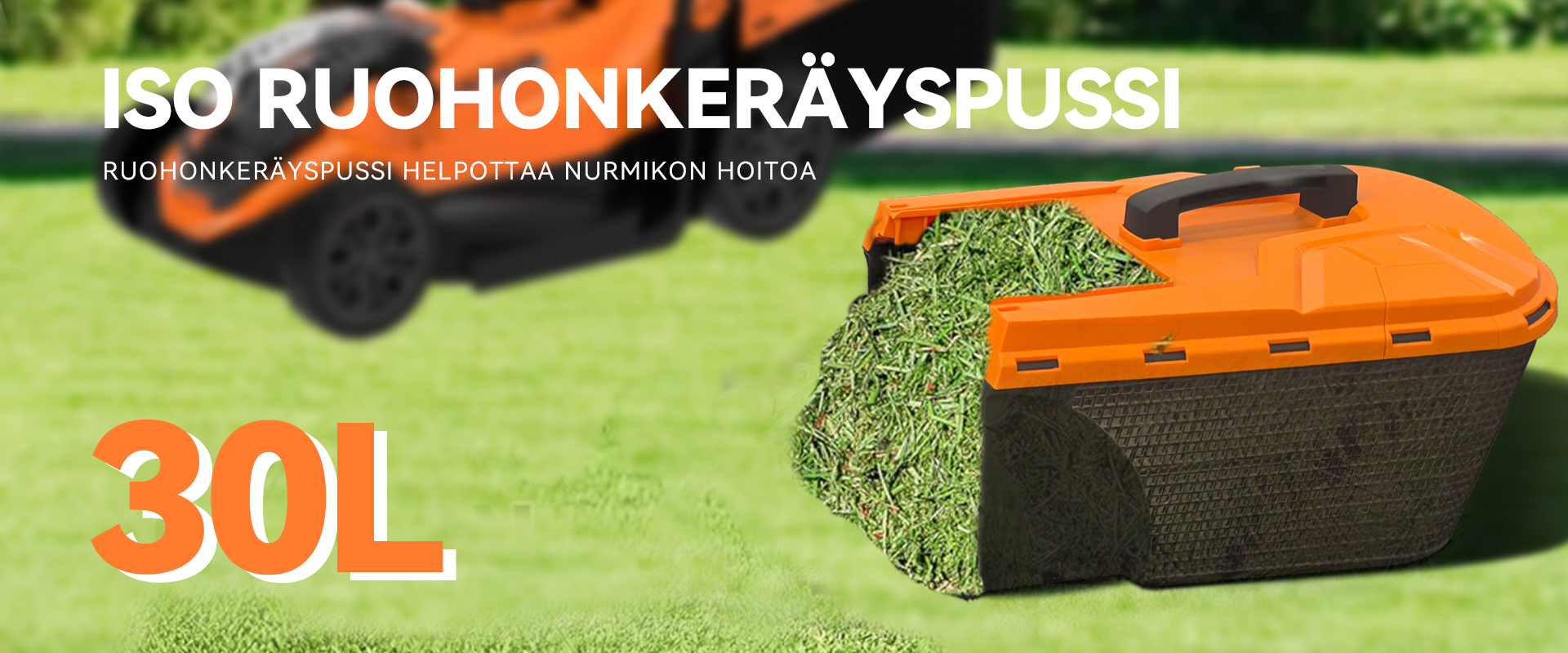 Varustettu 30 litran hybridiruohonkeräyspussilla, joka on suunniteltu optimaaliseksi ilman kiertoksi ja ruohonleikkuiden tiivistämiseksi.