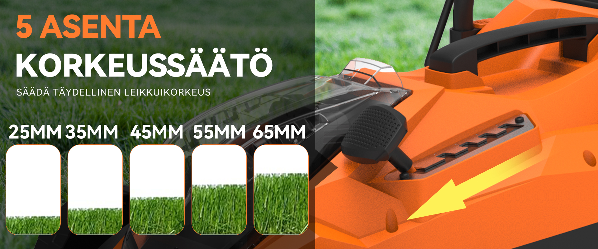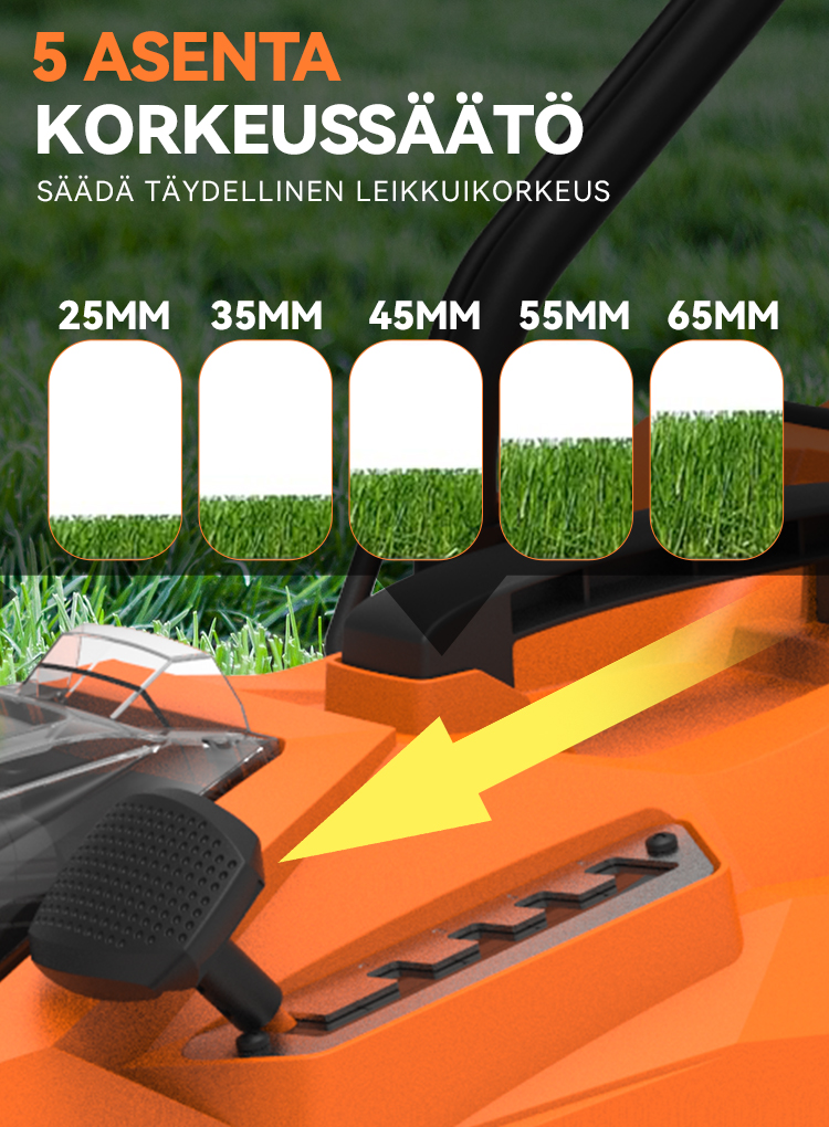 Säädä nurmikkosi täydellinen ulkonäkö helposti 25-65mm välillä yhden napin keskitetyllä säätöjärjestelmällä.
