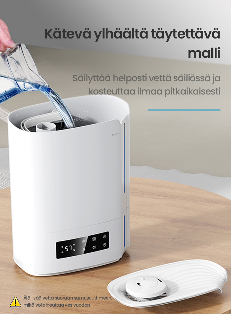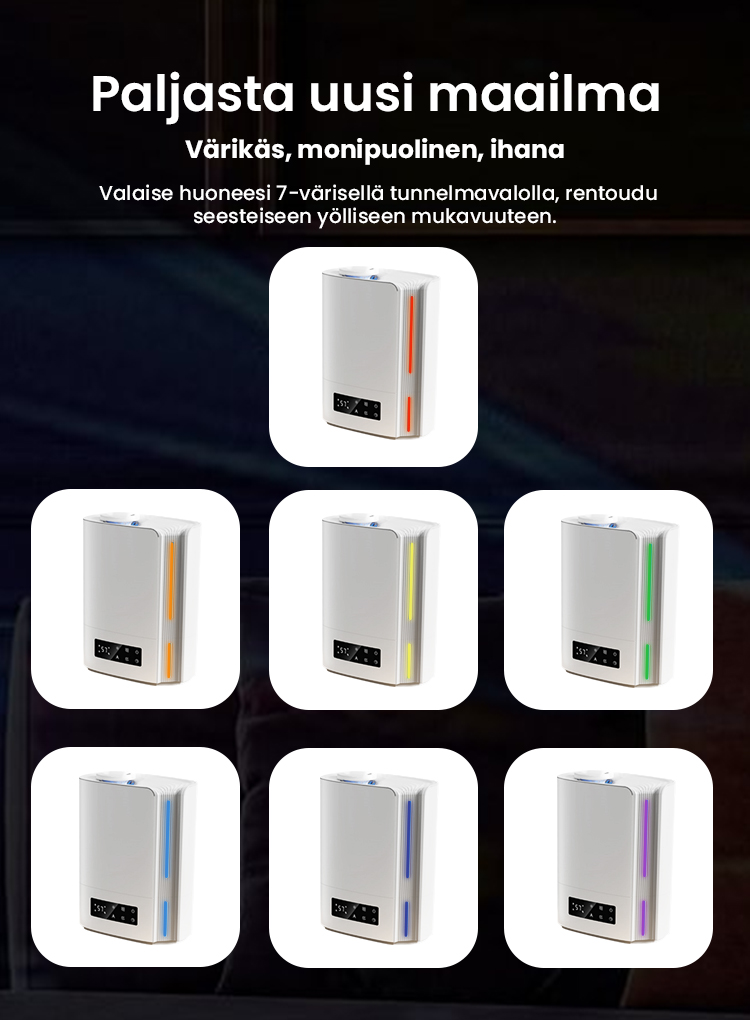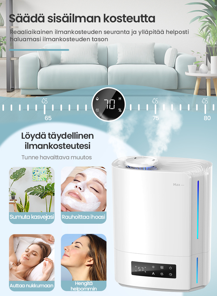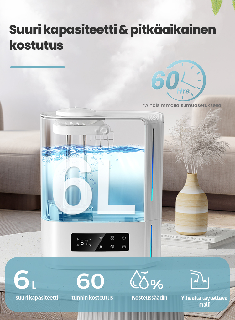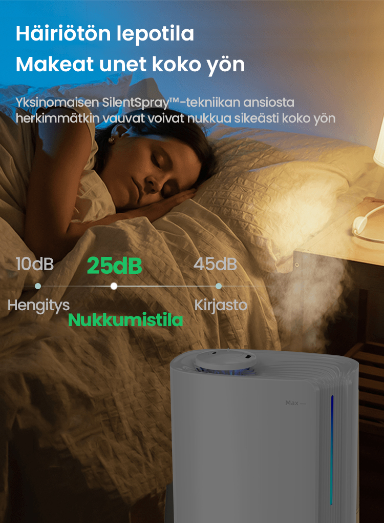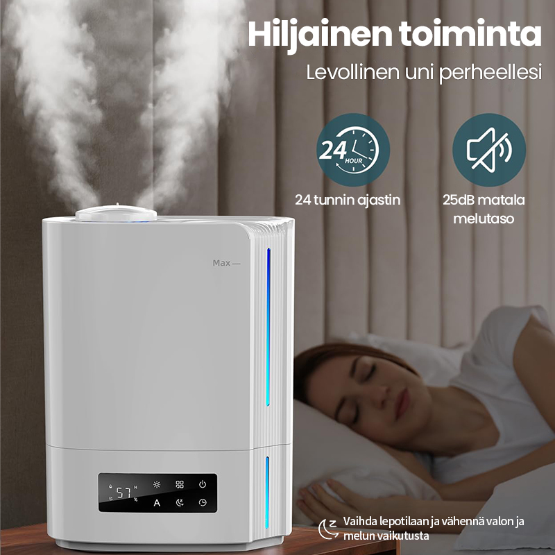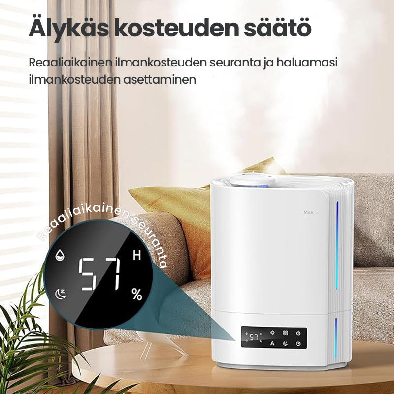Tekoälyalgoritmin automaattinen älykäs toiminta, joka laskee ympäristön muuttuvan kosteuden ja lämpötilan mukaan ja säätää sumutehoa dynaamisesti automaattisesti, jotta ihanteellinen terveellisin ilmankosteus pysyy 45-60 %:n välillä.
