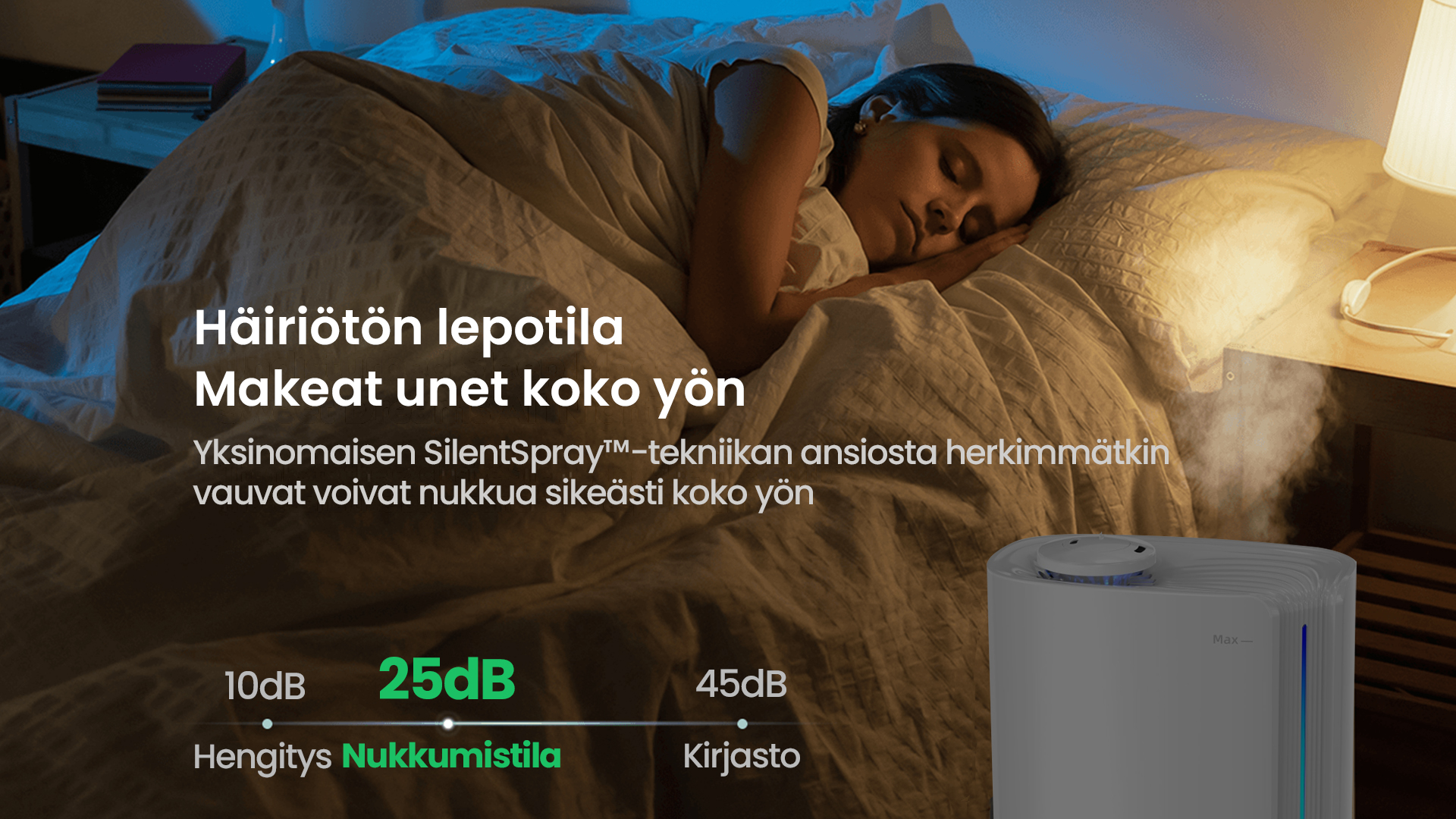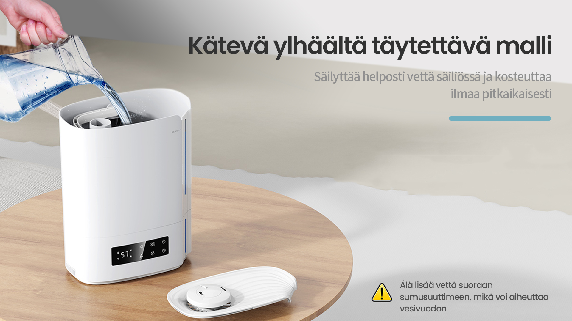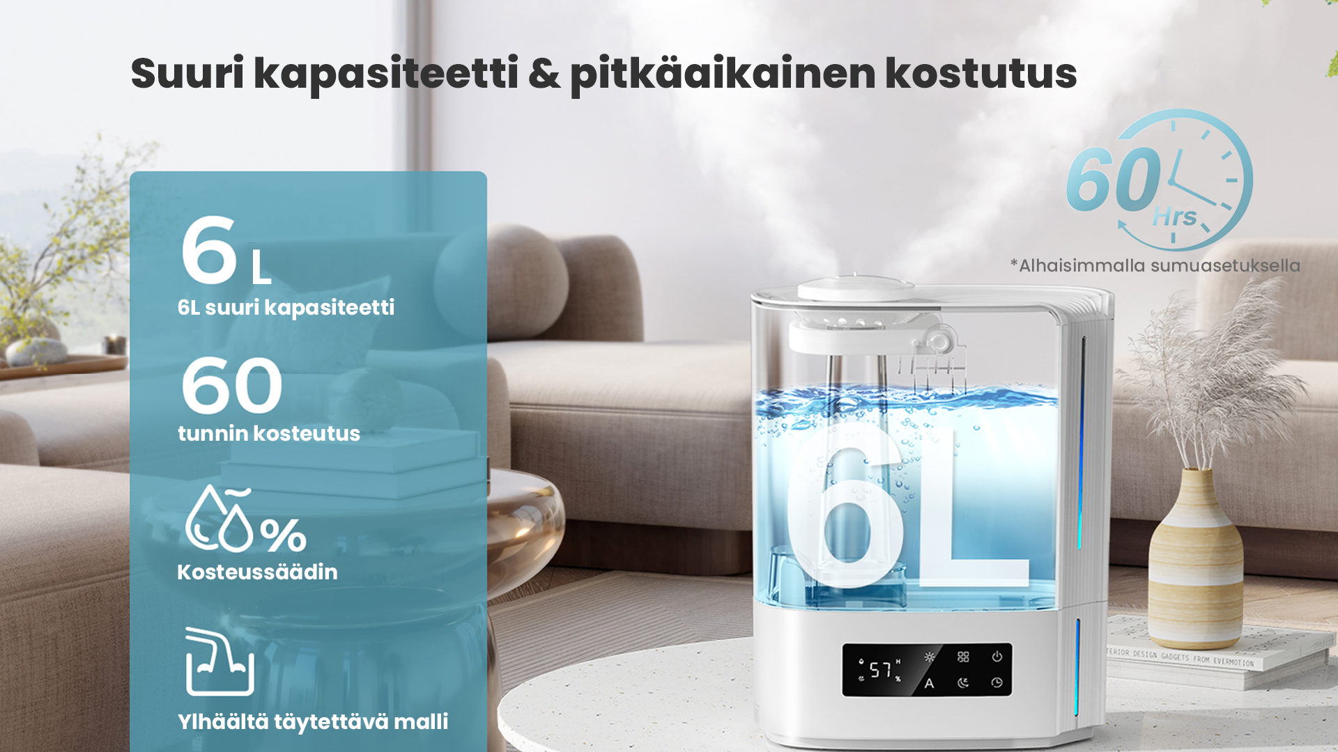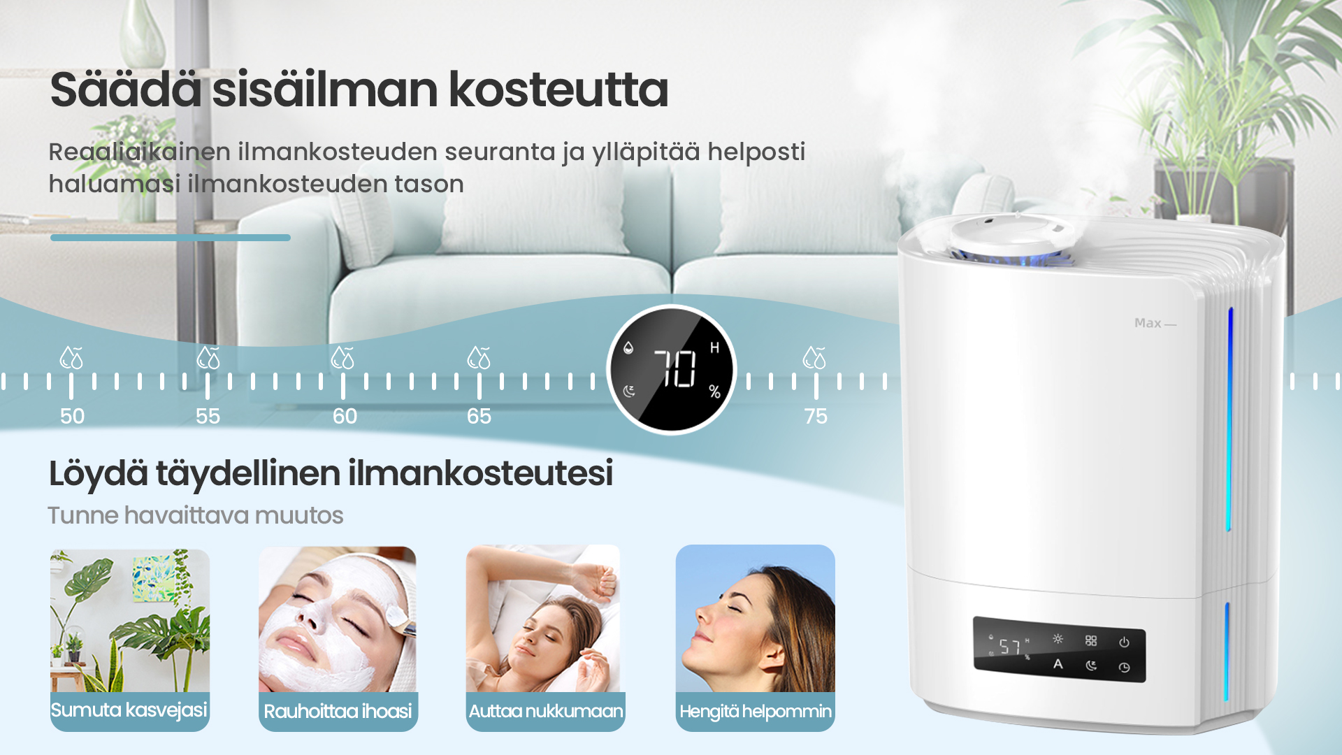 Tekoälyalgoritmin automaattinen älykäs toiminta, joka laskee ympäristön muuttuvan kosteuden ja lämpötilan mukaan ja säätää sumutehoa dynaamisesti automaattisesti, jotta ihanteellinen terveellisin ilmankosteus pysyy 45-60 %:n välillä.