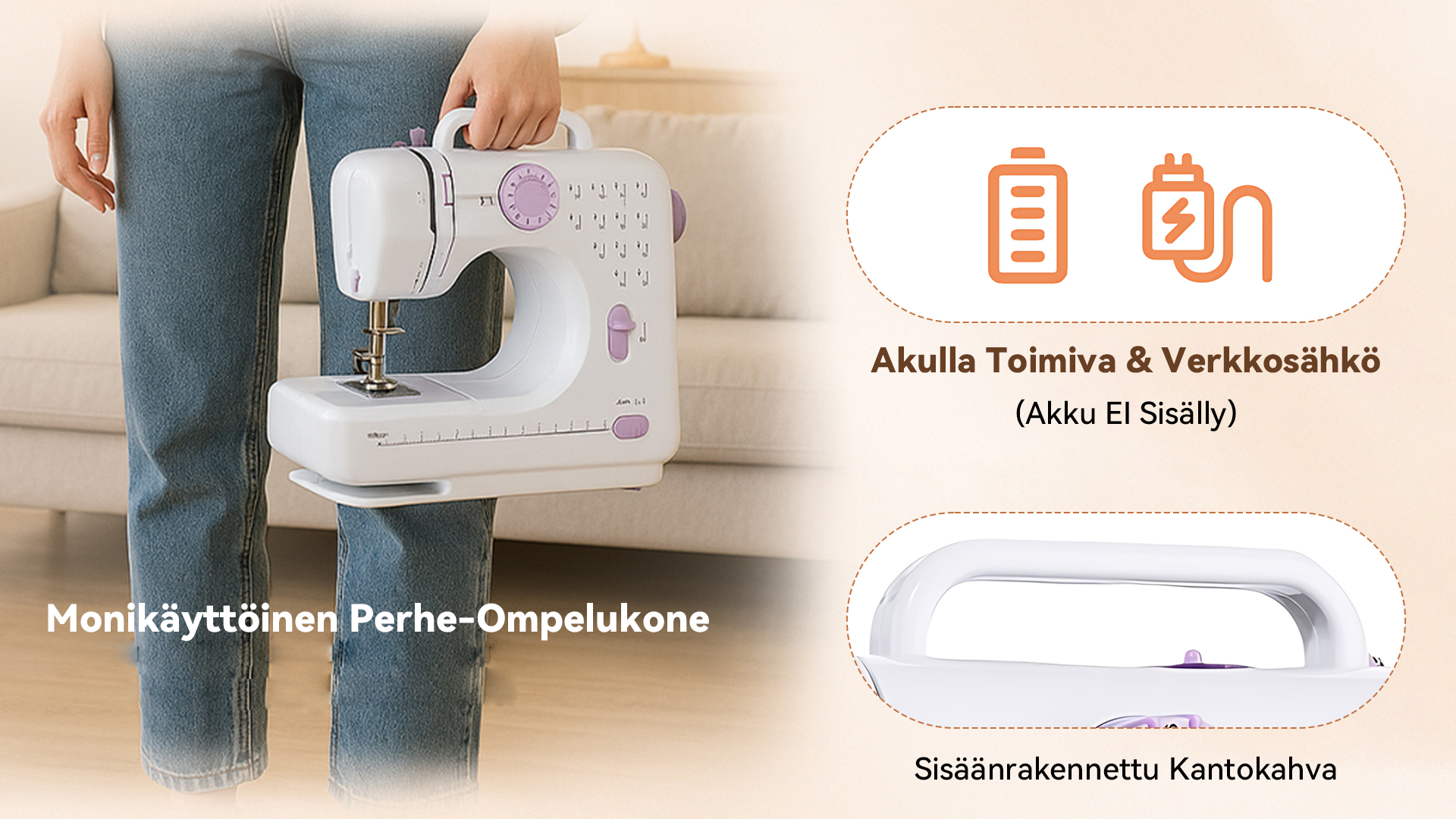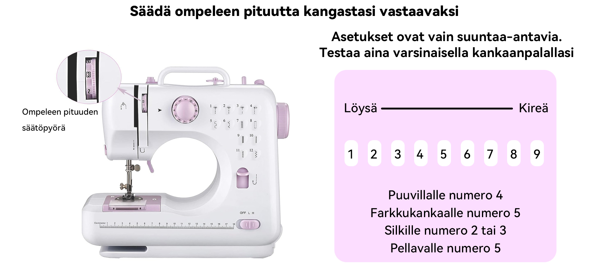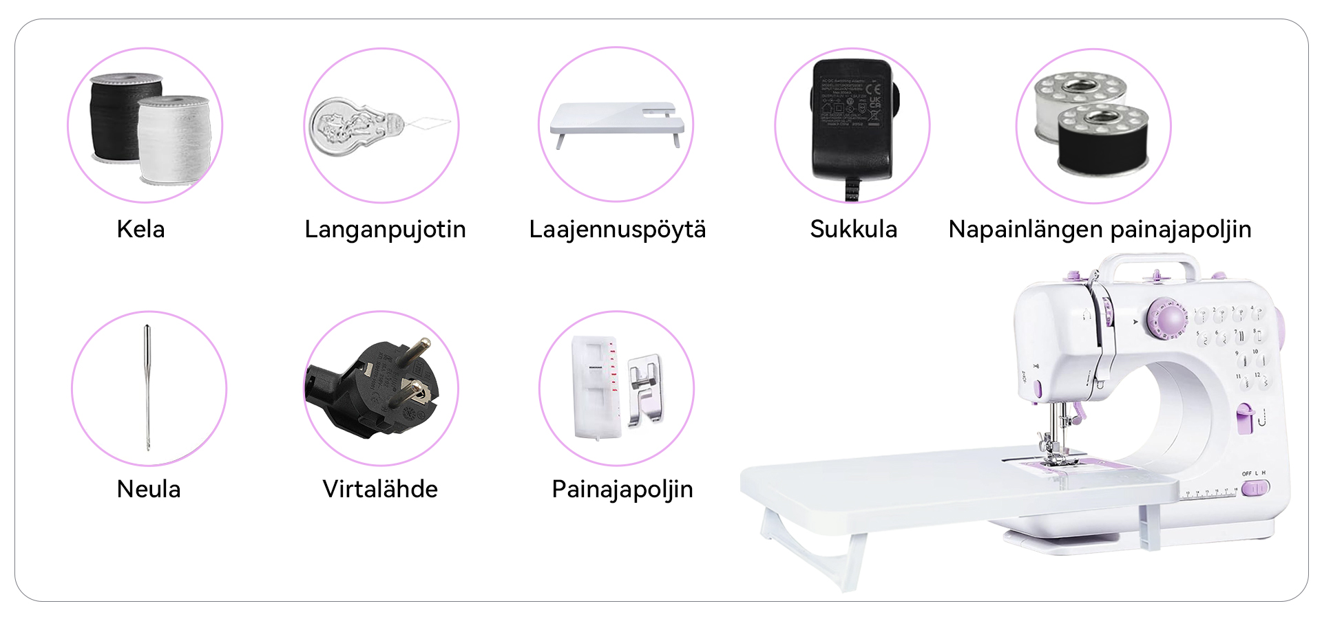 Keskeiset toiminnot: Mahdollistaa helposti reunahuolittelun, napinläpien ompelun ja perusompelun.