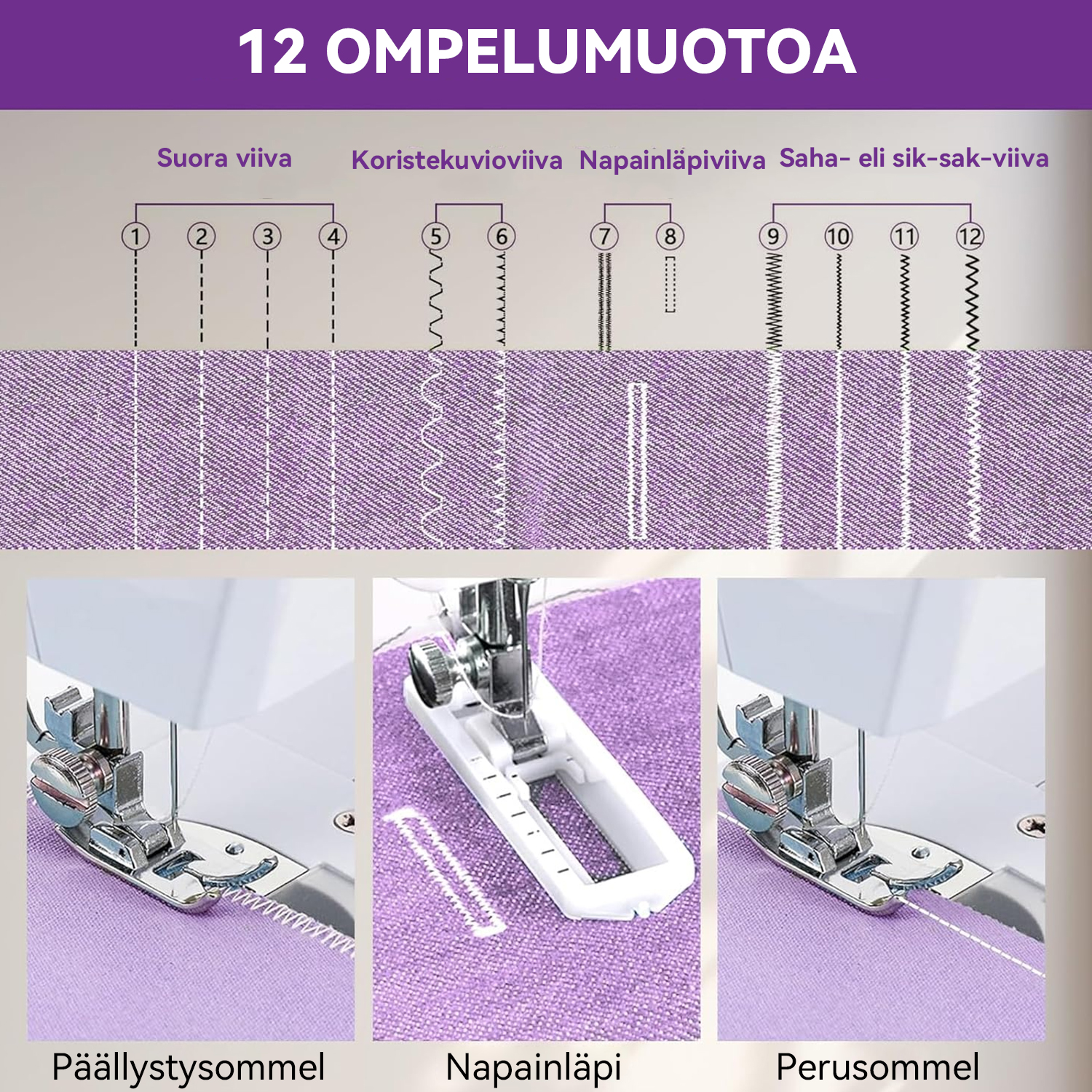 Siksak- ja napinläpiompeleet (9–12): Soveltuvat monipuolisiin tehtäviin, kuten reunahuolitteluun, napinläpien tekoon ja nappien ompeluun.