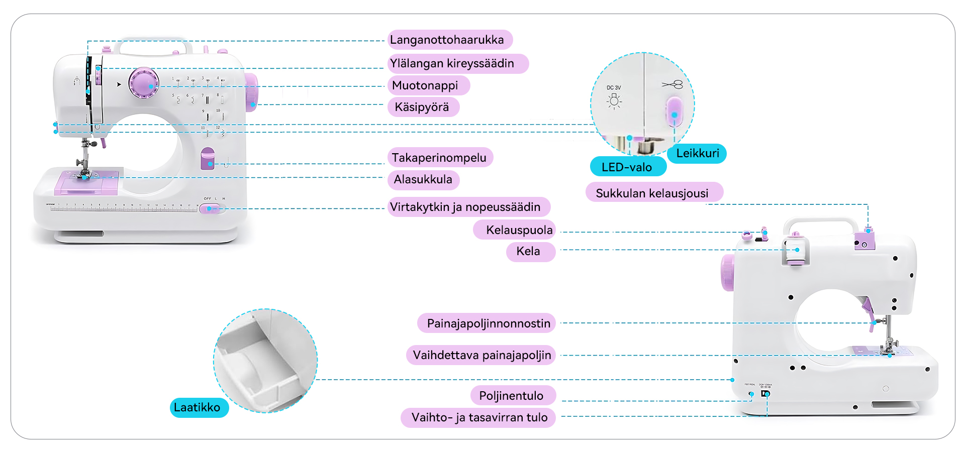 Kirkas LED-valo – Valaisee ompelualueen tarkkaa työskentelyä varten kaikissa valaistusolosuhteissa.