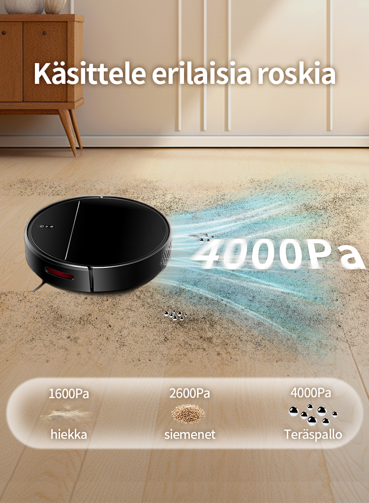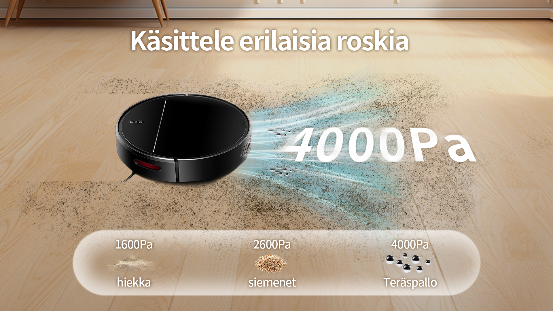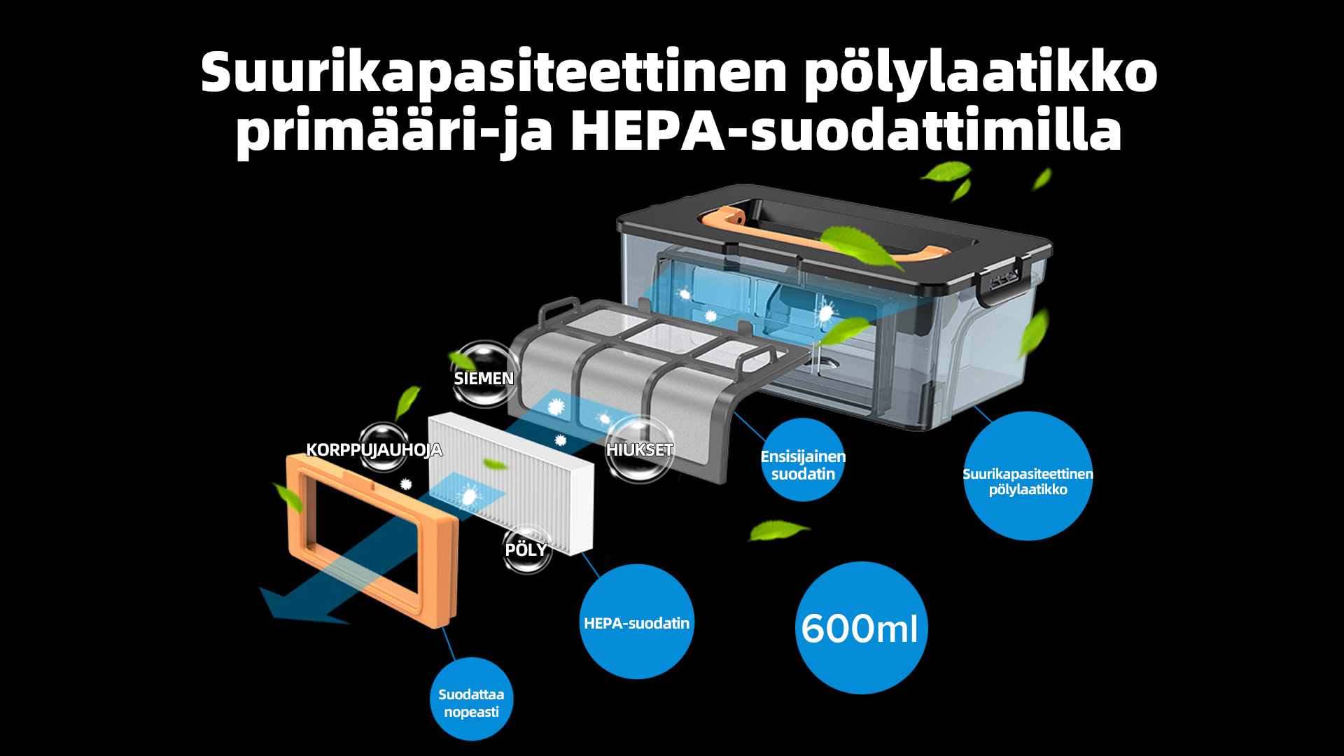 Akkukapasiteetti on suuri, jopa 4400 mAh. Yhdellä latauksella se pystyy siivoamaan 180 m² tilaa. Käytännössä tämä usein tarkoittaa, että koko kotisi puhdistaminen onnistuu yhdellä latauskerralla.
