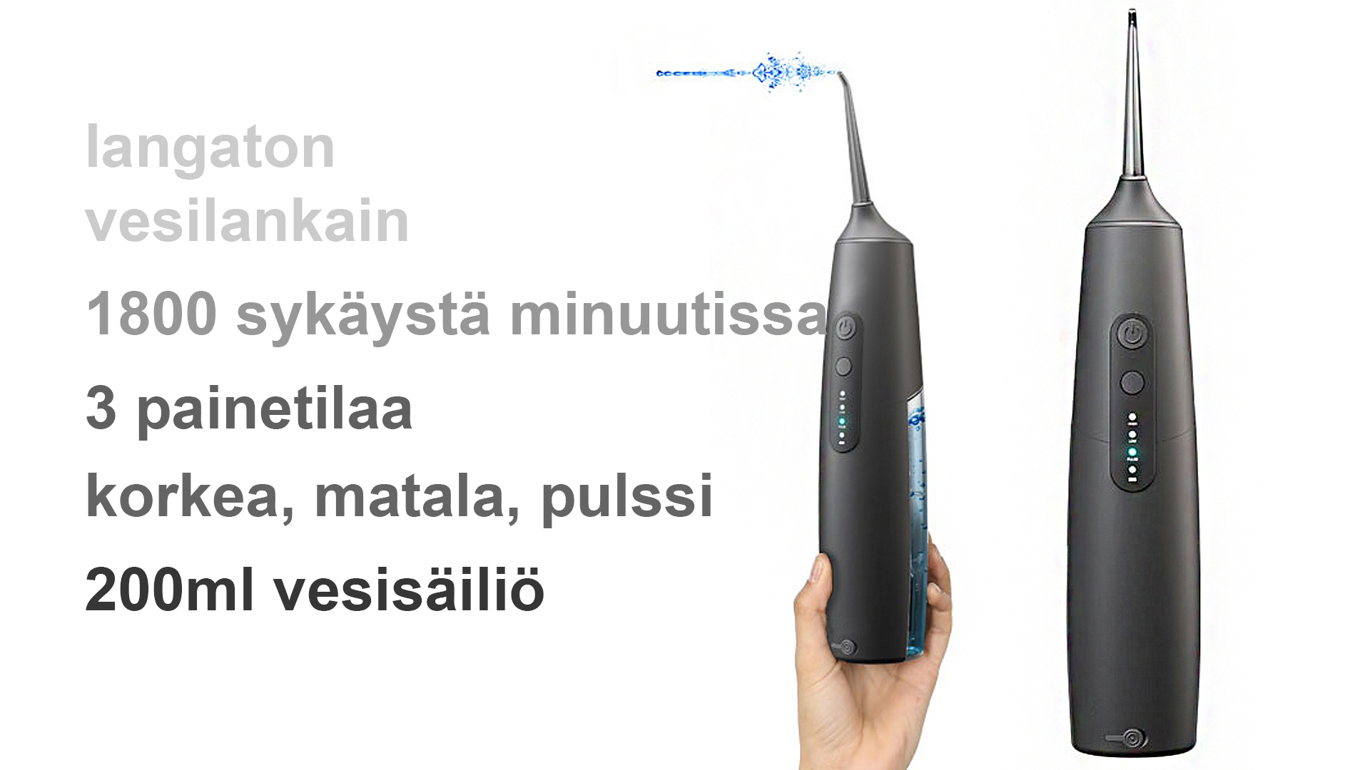 Uusin langaton vesihammashoitolaite tarjoaa ainutlaatuisen yhdistelmän vedenpaineesta ja 3 hammaslanganhoitotilaa (korkea, matala ja pulssitoiminto), mikä takaaksi parhaan hampaiden puhdistustehon ja tehostetun hammaslangan käytön. Painevesi hieroo ikeniä verenvuodon estämiseksi ja puhdistaa syvästi hammaskiveä sekä ruokajäämiä, joihin perinteinen hammaslanka ei pysty.