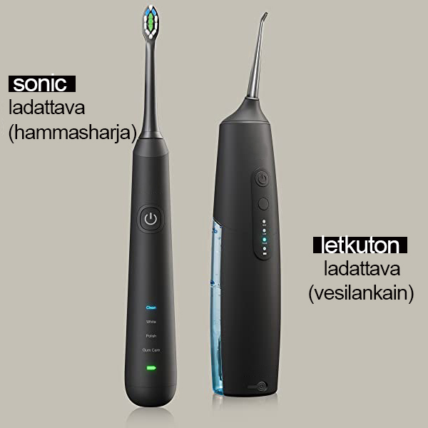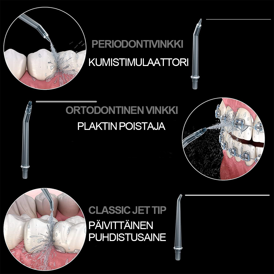 All-in-One -langaton vesihammaslanka ja sähköhammasharja -yhdistelmä — harja ja hammaslanka kerralla. Takaat valkoisemmat hampaat ja terveemmät ikenet, ja se sopii erinomaisesti myös hammasrautojen hoitoon.