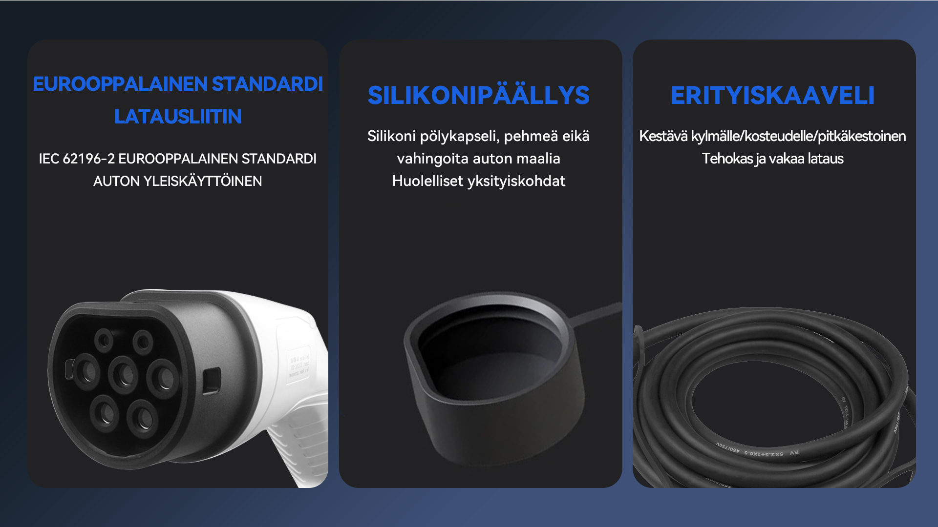 Type 2 -latauskaapelimme on kehitetty vastaamaan eurooppalaisten sähköautoilijoiden todellisia tarpeita. Lataatpa sitten kotona, työpaikalla tai julkisilla AC-latausasemilla, kaapelit tarjoavat luotettavan ja helppokäyttöisen ratkaisun päivittäiseen käyttöön kaikkialla Euroopassa.