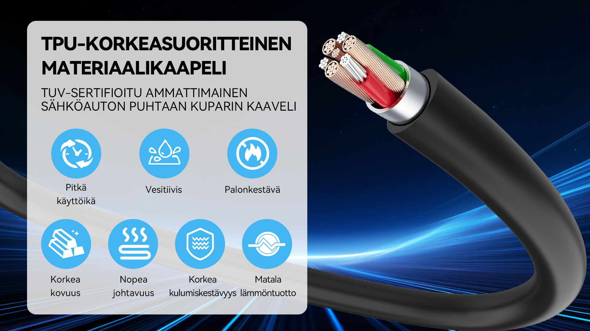 Tämä sähköauton latauskaapeli on valmistettu korkealaatuisista kuparijohtimista, jotka takaavat tehokkaan tehonsiirron ja vakaan lataussuorituskyvyn. Kaapelissa on TPE-eristys, jossa on UL94 V-0 -palonesto-ominaisuudet, parantaen joustavuutta, kestävyyttä ja turvallisuutta jokapäiväiseen sisä- ja ulkokäyttöön.